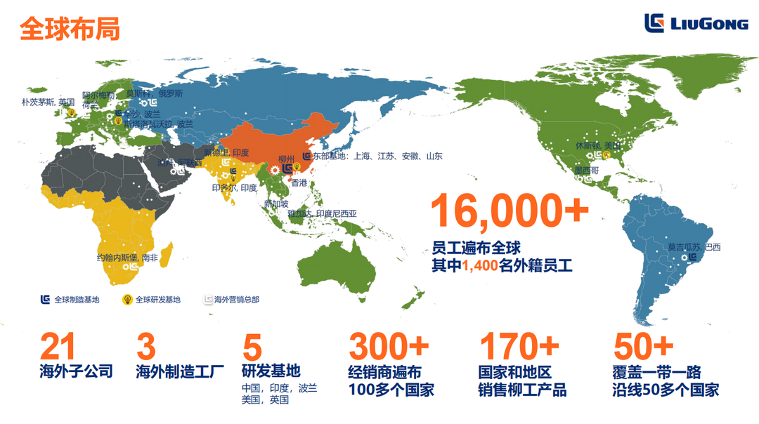 ? ? ? ?柳工在國(guó)際化領(lǐng)域處在行業(yè)的領(lǐng)先地位,全球擁有16000多名員工,300多家經(jīng)銷商、30家海外子公司和機(jī)構(gòu)、5個(gè)全球研發(fā)基地,產(chǎn)品遠(yuǎn)銷170多個(gè)國(guó)家和地區(qū),國(guó)際業(yè)務(wù)覆蓋“一帶一路”沿線85%的國(guó)家。近年來(lái),柳工海外市場(chǎng)保持高速增長(zhǎng)態(tài)勢(shì)。新冠疫情期間,柳工海外業(yè)務(wù)仍逆勢(shì)上揚(yáng)。2021年,柳工海外收入同比大幅增長(zhǎng)。今年1月份,銷量同比翻翻,實(shí)現(xiàn)高質(zhì)量“開(kāi)門紅”。