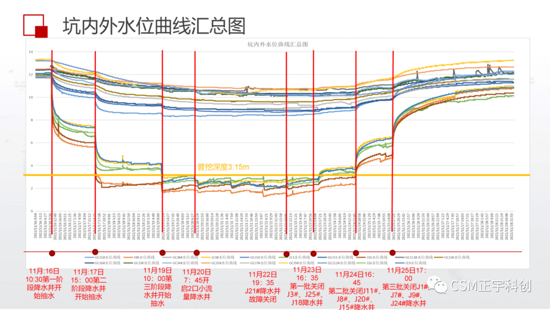 ? ? ? ?截止目前,基坑已順利完成第一層地下室的開(kāi)挖,整個(gè)開(kāi)挖過(guò)程中地下水控制良好,鄰近的武漢軌道交通2號(hào)、3號(hào)線和周邊監(jiān)測(cè)數(shù)據(jù)顯示,累計(jì)沉降量、變化速率均在報(bào)警值范圍內(nèi),無(wú)異常情況。